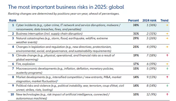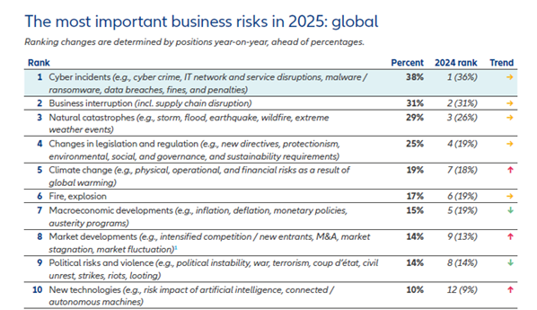 Allianz Risk Barometer 2025: Οι κυβερνοεπιθέσεις αναδεικνύονται ως ο μεγαλύτερος επιχειρηματικός κίνδυνος παγκοσμίως, ενώ η κλιματική αλλαγή φτάνει σε ιστορικά υψηλά επίπεδα